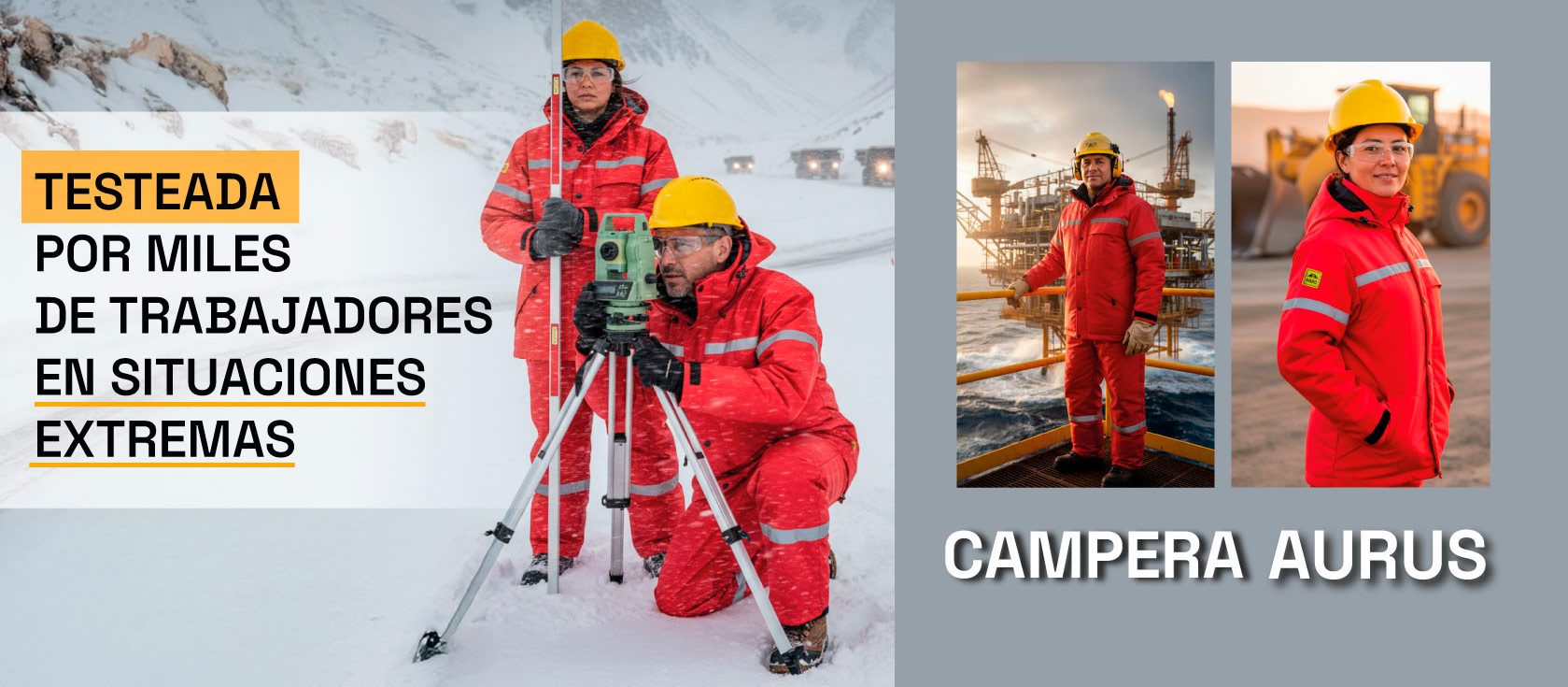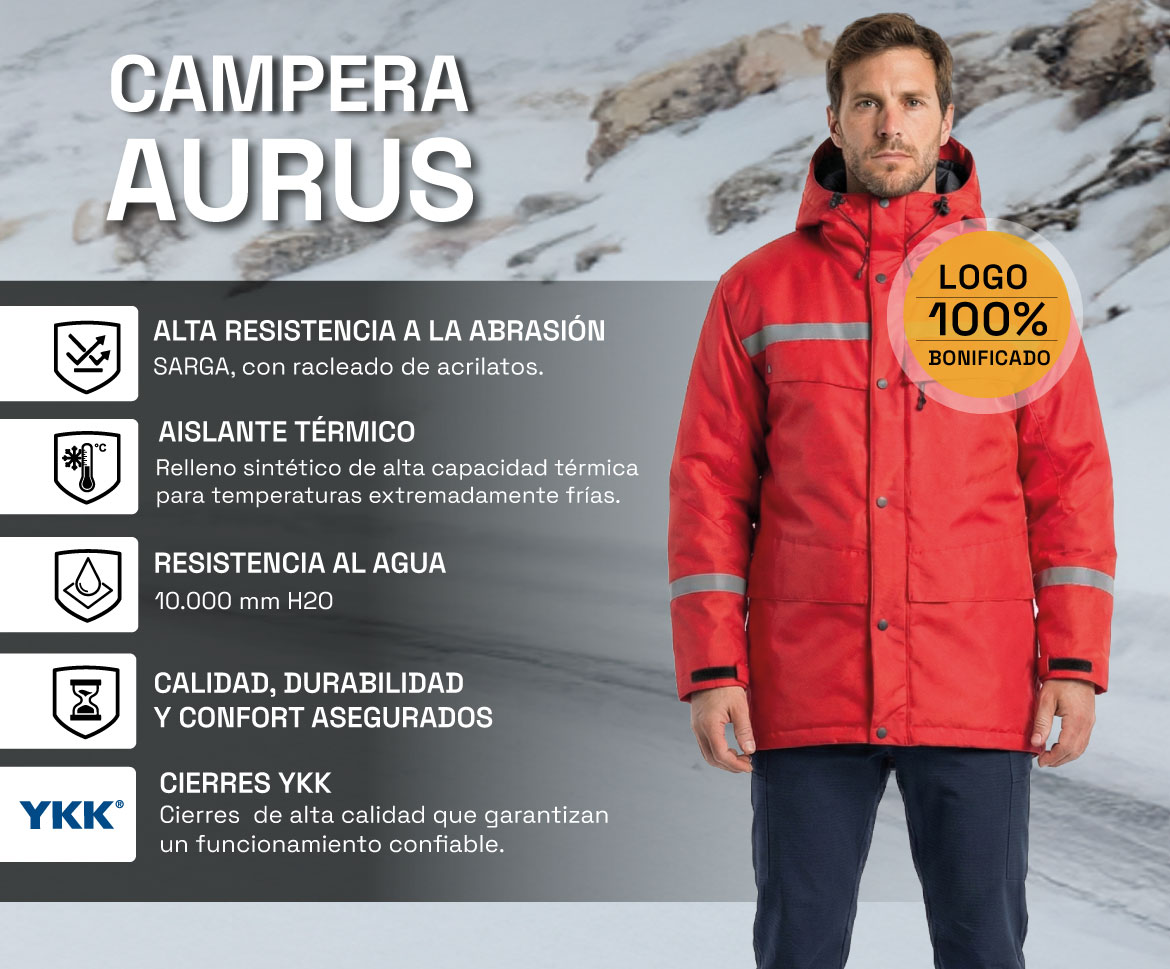 La Campera Aurus, diseñada como ropa de trabajo e indumentaria que protege a los trabajadores de las bajas temperaturas. Térmica y resistente a la abrasión, ofrece un alto nivel de comodidad, confort y rendimiento en entornos fríos y condiciones extremas. Está desarrollada y diseñada para equipos que operan en: